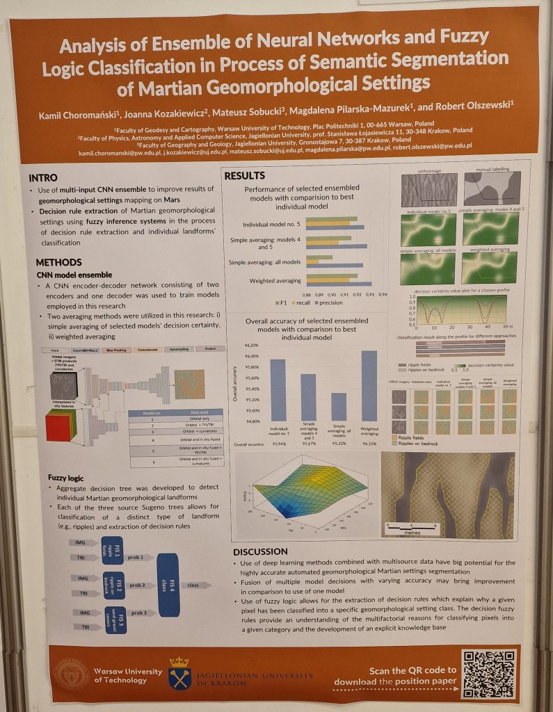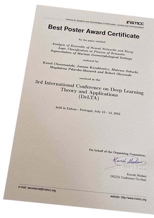 Podczas konferencji 3rd International Conference on Deep Learning Theory and Applications (DeLTA), która odbyła się w 2022 r. w Lizbonie wspólny referat naukowy przygotowany przez zespół Politechniki Warszawskiej oraz Uniwersytetu Jagiellońskiego prezentował wyniki badań dotyczących wykorzystania sztucznych sieci neuronowych do segmentacji form geomorfologicznych występujących na Marsie. Poster naszego zespołu, prezentowany przez Kamila Choromańskiego uzyskał podczas tej konferencji główną nagrodę w swojej kategorii.